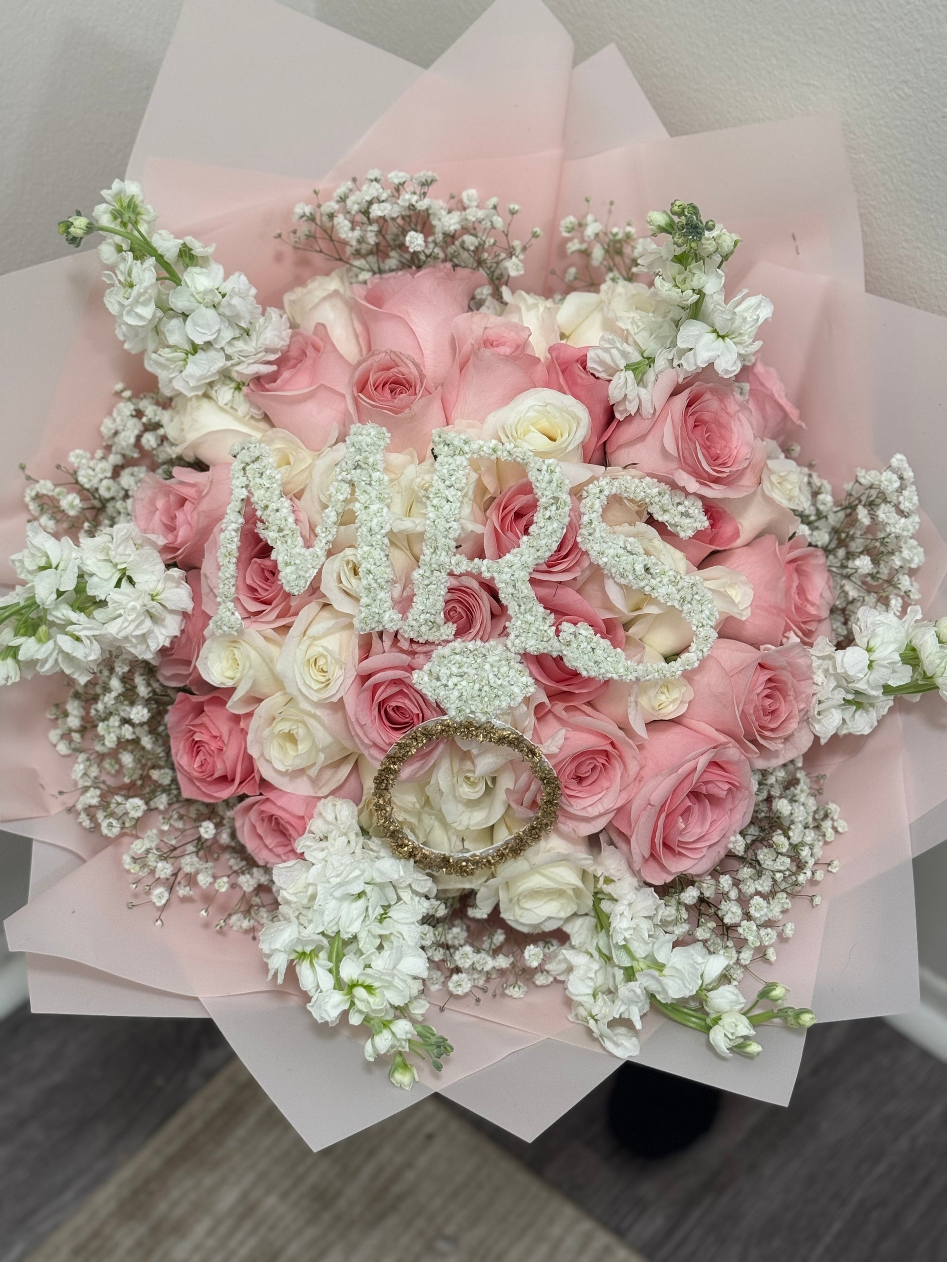 Celebrate the bride-to-be with a stunning floral statement designed to make her feel loved and celebrated. This elegant bouquet features a lush mix of 50 premium roses in soft, romantic tones, accented with fresh stock and delicate baby’s breath. Finished with your choice of a “MRS” or “Bride to Be” topper, this arrangement is perfect for bridal showers, engagement parties, or gifting ahead of the big day.